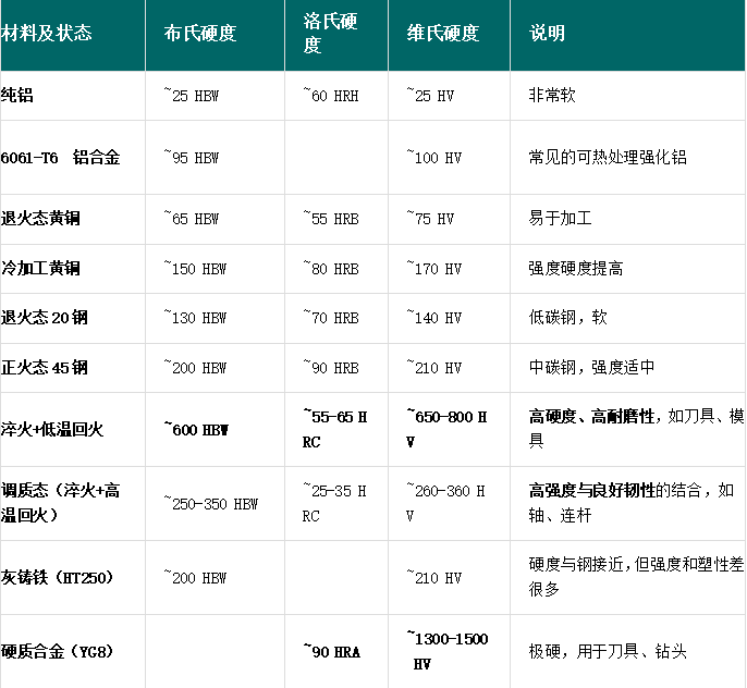 以下是一些在工程中常见材料或热处理状态下的典型硬度范围。