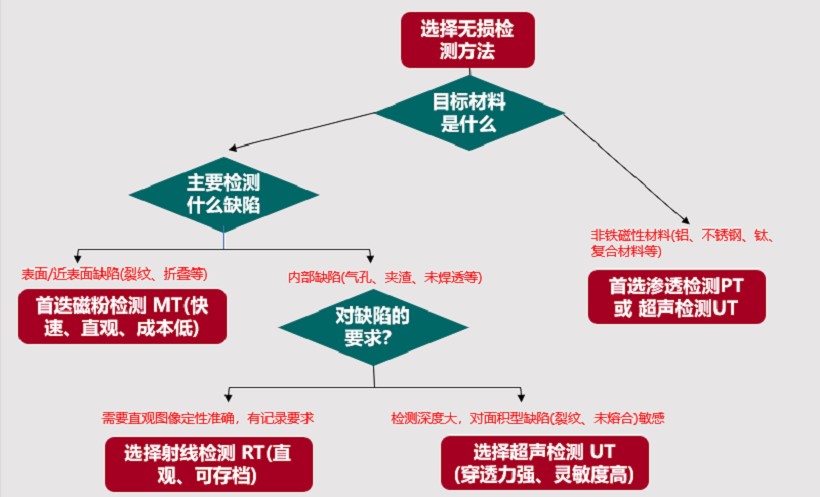 这张流程图提供了一个简单实用的判断方式,帮助你根据材料类型、缺陷位置检测要求,快速选出蕞合适的无损检测技术: