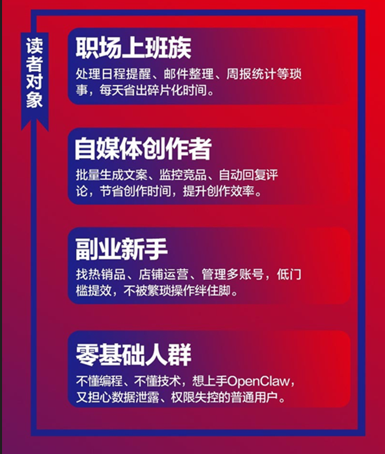 第五部分提供职场邮件自动化、内容创作监控、代码审查部署、知识管理、社交媒体运营等五大实战案例,每个案例包含完整操作流程、API配置、Skills调用及故障排查。 全书采用“原理—配置—实战”渐进式结构,配备实战任务清单、命令速查表、配置文件模板及常见问题解决方案,面向程序员、职场人士、创业者和内容创作者,帮助读者将OpenClaw打造为真正会干活、能进化的24小时数字员工。
