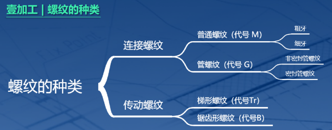 三角螺纹以代号M的普通螺纹和代号G的管螺纹为主。M螺纹是很常用的连接螺纹,分为粗牙和细牙,细牙主要用在细小或薄壁零件上。管螺纹用于水管、气管等管路的连接。梯形螺纹代号为Tr,用于各种机床丝杠的动力传动。代号B的锯齿形螺纹只能以单方向传递动力。图5是按用途和牙型的螺纹分类。