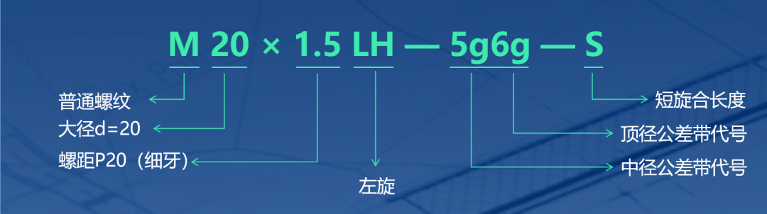例1:M20x1.5LH-5g6g-S 表示什么螺纹?例2:B36x14(P7)-7H-L 是指哪类螺纹?例3:如何表示公称直径为20,螺距为1.5的左旋单线程细牙普通螺纹?