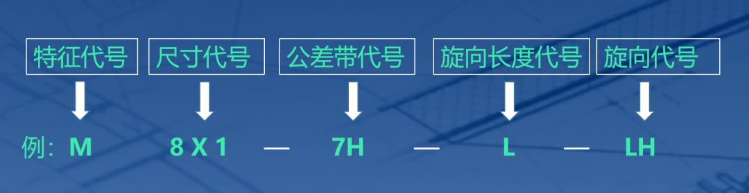 各部分代号注释:特征代号表示螺纹类型,比如M表示普通螺纹;尺寸代号表示公称直径×螺距,比如8x1表示公称直径为8,螺距为1;公差带代号由公差等级(数字)和基本偏差(外螺纹用小写字母,内螺纹用大写字母表示)所组成;旋合长度代号用代号L,N和S分别表示长,中和短,螺纹为中等旋合长度时,代号N不标注;旋向代号 左旋螺纹标注LH,右旋螺纹不标注。